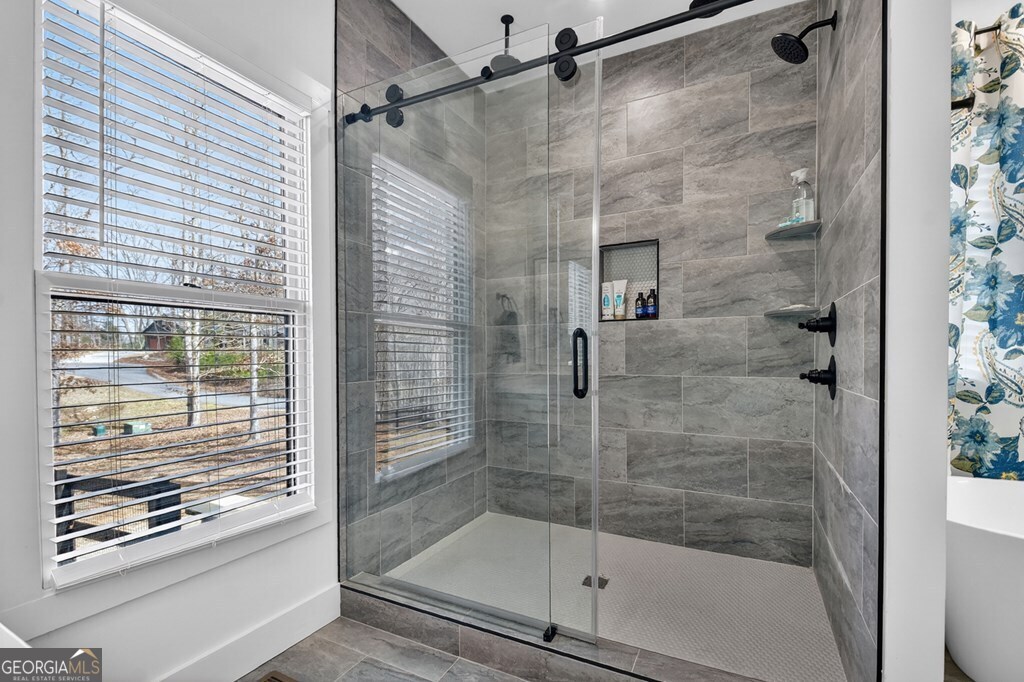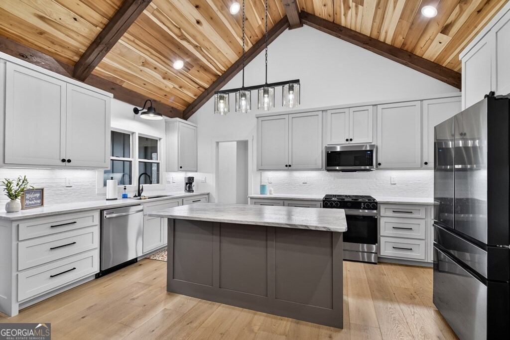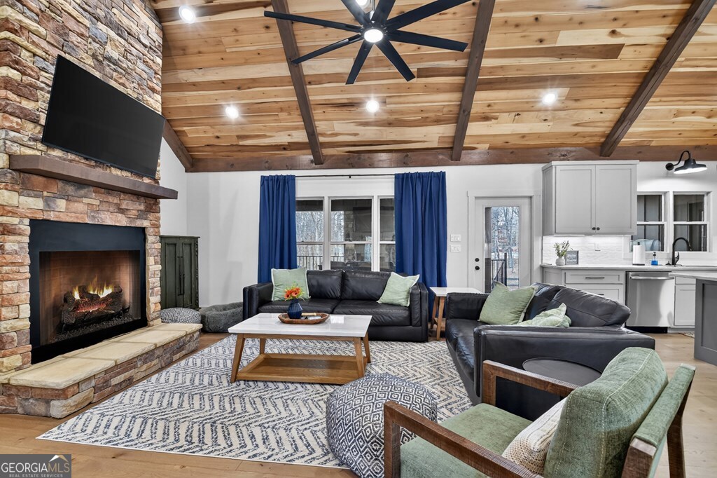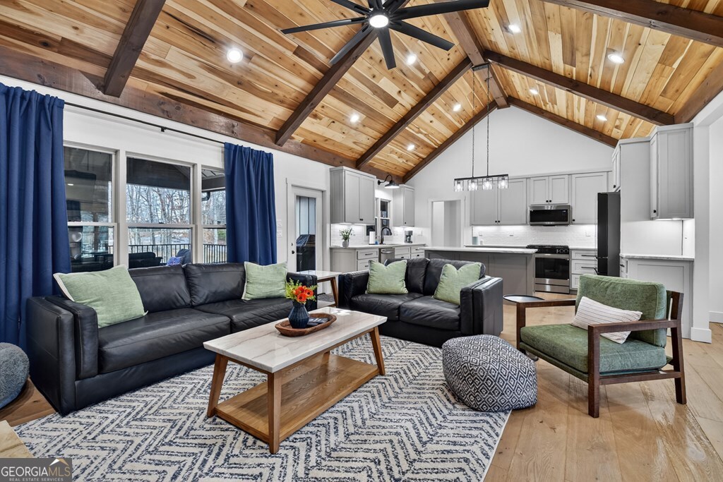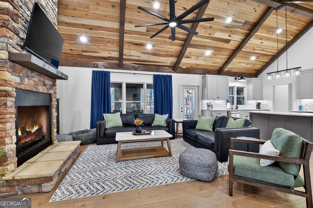 Welcome to this stunning Craftsman home, perfectly situated just minutes from town. Set on a level, one-acre lot, this spacious 4-bedroom, 3.5-bath residence offers both comfort and style, with a fenced backyard ideal for relaxing or entertaining. Step inside to discover a thoughtfully designed open floor plan that seamlessly blends the living room, dining area, and kitchen beneath soaring cathedral ceilings. The wood-clad ceiling with decorative beams and the rock-faced gas fireplace create a warm, inviting space that's perfect for entertaining. The main bedroom is generously sized and features a striking wood accent wall and cathedral ceiling. At the same time, the luxurious en-suite bathroom boasts dual vanities, a soaking tub, and a tiled shower with multiple shower heads. The kitchen is a chef's dream, featuring granite countertops, stainless steel appliances, a gas stove, a large island, and a walk-in pantry. Just off the kitchen, a convenient half bath is easily accessible. The laundry room and extra storage are located near the double-car garage, which includes an EV charger. Above the garage, there's a full guest suite with its own living area, full bathroom, walk-in closet, and attic storage. On the opposite side of the home, two additional bedrooms also feature cathedral ceilings, walk-in closets, and beautiful wood accents. They share a well-appointed bathroom with a double vanity and a separate shower room-perfect for sharing. Enjoy outdoor living on the expansive covered deck, complete with a wood-burning fireplace (with gas starter), a large hearth, TV, and dining area. The backyard is fenced, but your property extends even further, providing plenty of room to play or garden. The exterior features classic board-and-batten siding, iron railings, and stained decks. Additional highlights include a buried propane tank and a paved driveway leading up to the home. This well-appointed Craftsman could be your forever home.