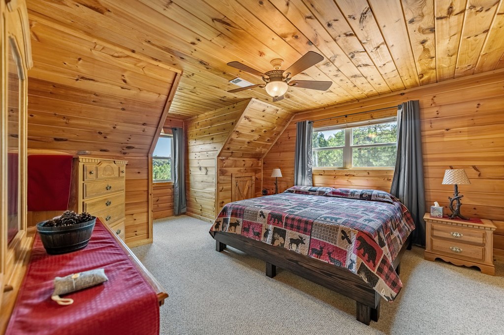 Charming Cabin with Mountain Views and Fiber Internet! Sundeck and covered porch! Turn key home has three levels, featuring 3 bedrooms and 3 bathrooms. On the Upper level there is a Bedroom, full bath and spacious loft. On the Main level there is a gas fireplace that is rocked up to the cathedral ceiling, tilt-out windows for convenient cleaning, a wrap-around deck, and a two-car garage!! The basement level features a third bedroom and bathroom with a family/game room and a workshop area. Situated atop Havenwood Rd in Ivy Mill Estates, it benefits from paved roads, county water, and close proximity to Lake Nottley. This home has its own putting green that can be converted to a firepit area. Come enjoy the mountains at this cabin directly across from USFS land!